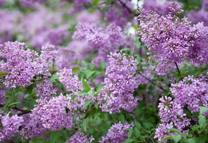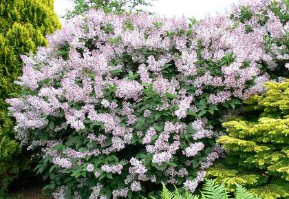 Сирень раскидистая Miss Kim (Мисс Ким). Красивый раскидистый кустарник с плотной кроной, диаметром до 2 м, высотой всего до 1,5-2 м. Цветки в рыхлых метельчатых соцветиях, нежно-розовые в бутонах с пурпурным оттенком, аромат приятный, насыщенный. Обильно цветёт в мае-июне.