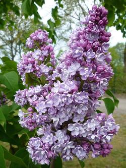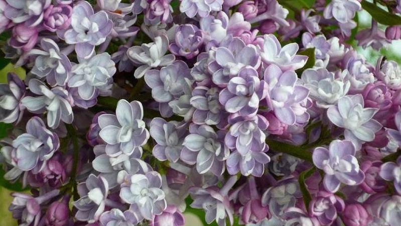 Сирень Montaigne (Монтень). Необычайно привлекательный сорт, очень нежный и изысканный. Среднего размера розоватые цветки быстро выгорают до лилово-белого тона. Они имеют форму полиантовых розочек — красивого сложения, из 2-3 тесно сближенных венчиков, заостренные лепестки которых загибаются внутрь. Соцветия из одной пары длинных, узких метелок. Кусты сильнорослые, прямые, с длинными побегами.