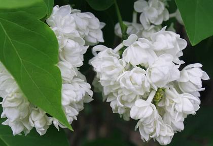 Сирень обыкновенная Память о Колесникове. Бутоны кремовые. Цветки чисто-белые, крупные, диаметром до 3 см, махровые — из трех венчиков, с легким ароматом, лепестки овальные, приподнимаются и закрывают центр. Цветки оригинальной формы, напоминают бутоны полиантовых роз и сохраняют такую форму до конца цветения.