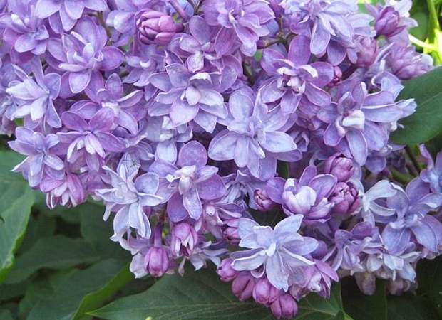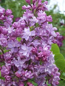 Сирень обыкновенная Память о С.М. Кирове. Цветки очень красивые, крупные, махровые, из 3-хвенчиков, похожи на розочки. Лепестки нижних венчиков овальные тёмно-синевато-лиловые, внутренние — мельче, они светлее, с серебристым оттенком, душистые. Соцветия крупные, чаще из одной пары крупных широкопирамидальных ажурных метёлок с сильно выделяющимися нижними разветвлениями. Нераскрывшиеся бутоны рядом со светящимися цветками создают эффектный контраст!