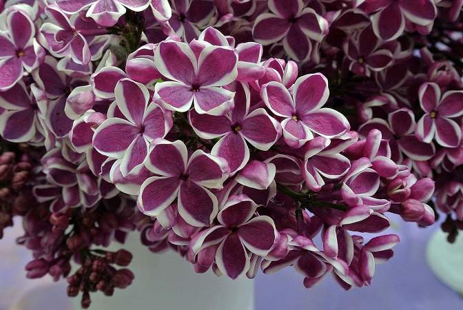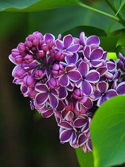 Сирень обыкновенная Sensation (Сенсация). Очень красивый сорт сирени. Кусты до 3,5 метров высотой и шириной до 3 м. Бутоны пурпурные, цветки пурпурно-красного цвета с белой четкой каймой по краю.
