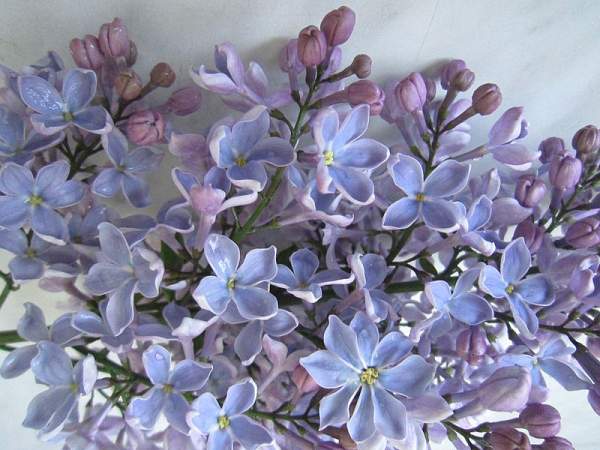 Сирень Тихая обитель. Соцветия длинные, рыхлые, сквозистые. Бутоны розово-лиловые, чуть зеленоватые. Цветки простые, крупные. Лепестки светло-синие с белыми стрелками, с обратной стороны лепестки розово-лиловые.