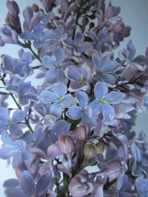 Сирень Тихая обитель. Соцветия длинные, рыхлые, сквозистые. Бутоны розово-лиловые, чуть зеленоватые. Цветки простые, крупные. Лепестки светло-синие с белыми стрелками, с обратной стороны лепестки розово-лиловые.