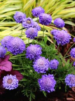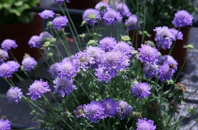 Скабиоза Ritz Blue (Ритц Блу). Невысокий многолетник, высотой до 25-30 см. Прикорневые листья широколопатчатые, крупнозубчатые; стеблевые — перисто-раздельные с продолговатыми лопастями. Цветки мелкие, голубовато-фиолетовые, собраны в одиночные плотные удлиненные головчатые соцветия до 7 см в диаметре, на длинных гибких цветоносах. Цветет с июля по сентябрь.