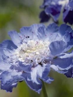 Скабиоза кавказская. Голубые с лиловым оттенком цветки собраны в головчатое соцветие диаметром до 10 см. Ароматные цветки имеют куполообразную форму с тычинками. Стебли у скабиозы кавказской прямые, прочные, слабоветвистые, опушенные. Прикорневые листья линейно-ланцетные, черешковые, слегка сизоватые, а стеблевые листья сидячие.