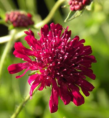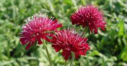 Травянистый ажурный кустик с опушенными прямостоячими стеблями, на которых появляются винно-красные головчатые соцветия. Цветущий куст очень декоративен, до поздней осени сохраняет компактную форму.