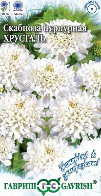 Скабиоза пурпурная Хрусталь махр.. Крупноцветковая скабиоза — неприхотливое однолетнее растение из семейства Ворсянковых. Стебель прямой, разветвляющийся, высотой до 90 см. Прикорневые листья ланцетно-овальные, крупнозубчатые, стеблевые — супротивные, перисто-раздельные. Мелкие цветки собраны в головчатые соцветия диаметром 5-6 см. Соцветия белые, махровые, на длинных прочных цветоносах, что особенно ценно для цветочных аранжировок. Предпочитает солнечнее места с плодородной рыхлой почвой. Размножают семенами: посев на рассаду — в феврале-марте; в открытый грунт — в апреле-мае, выдерживая расстояние между растениями 35-40 см. Идеально подходит для клумб, рабаток. В срезке стоит очень долго. Отлично переносит пересадку даже в цветущем состоянии.