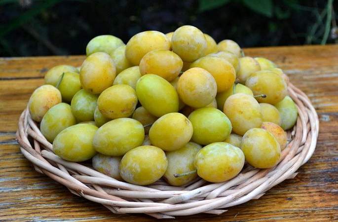 Слива Очаковская желтая. Разрастаются в высоту до четырех метров и имеют густую крону. Побеги средней толщины красного цвета, сильно склоняющиеся книзу. Сорт позднего срока созревания. Урожай готов к сбору в конце августа — начале сентября.