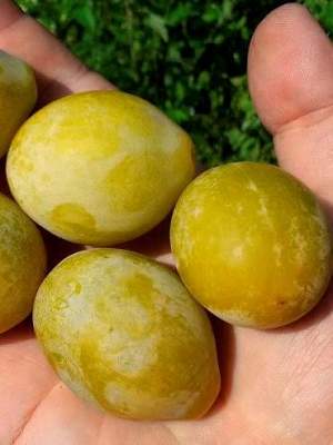 Плоды среднего размера, массой до 40 грамм. Кожица желто-зеленая, средней плотности. Мякоть желтая, сочная, ароматная, прозрачная, сладкая с небольшой кислинкой. Используют урожай сливы домашней Очаковская Желтая преимущественно для свежего потребления.