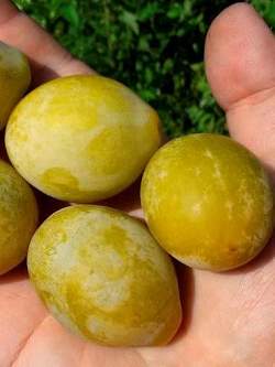 Слива Очаковская желтая. Разрастаются в высоту до четырех метров и имеют густую крону. Побеги средней толщины красного цвета, сильно склоняющиеся книзу. Сорт позднего срока созревания. Урожай готов к сбору в конце августа — начале сентября.