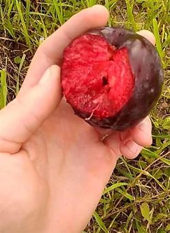 Слива пирамидальная Бербанк Гигант. Раннего срока созревания. Дерево пирамидальной формы, высота до 5 м. Плоды очень крупные, круглые, бордовые или фиолетовые, с едва заметным сизым налетом. Кожица плодов очень плотная. Мякоть также плотная, тёмно-бордовая, ароматная, сладкая с кислинкой. Косточка небольшая, не отделяется. После созревания плоды не опадают. Плодоношение на 3-4-й год после посадки. Самоплодный.