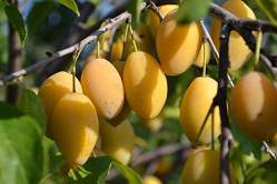 Слива Золотое Руно. Среднерослое дерево с плакучей густой кроной. Плоды массой от 30 г, удлиненно-обратнояйцевидные, с короткой шейкой, янтарно-желтые, с молочным восковым налетом и с золотистыми подкожными точками, плотной янтарной хрящеватой мякотью, отличного десертного вкуса. Косточка легко отделяется от мякоти.
