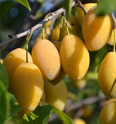 Слива Золотое Руно. Среднерослое дерево с плакучей густой кроной. Плоды массой от 30 г, удлиненно-обратнояйцевидные, с короткой шейкой, янтарно-желтые, с молочным восковым налетом и с золотистыми подкожными точками, плотной янтарной хрящеватой мякотью, отличного десертного вкуса. Косточка легко отделяется от мякоти.
