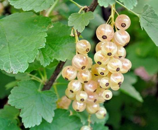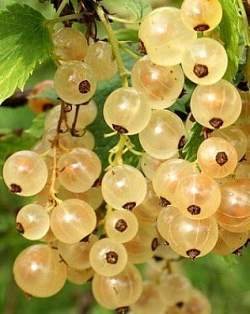 Смородина Голландская белая. Ранний сорт белой смородины, самоплодный. Куст невысокий, среднераскидистый. Ягоды среднекрупные, эллипсовидной формы, кремового оттенка, очень сочные. Отрыв мокрый. Вкус кисло-сладкий.
