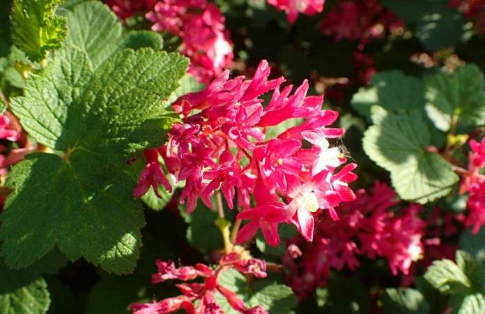 Смородина кроваво-красная Pulborough Scarlet (Пулборо Скарлет). Кустарник до 250 в высоту. Молодые побеги и листья ароматные. листья 3-5-лопастные, темно-зеленые, снизу покрыты беловатым войлоком. Цветки пурпурно-красные и розовые в многоцветковых поникающих кистях. Цветение обильное с третьего года жизни, во второй половине мая. Цветет в течение трех недель.