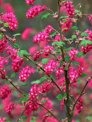 Смородина кроваво-красная Pulborough Scarlet (Пулборо Скарлет). Кустарник до 250 в высоту. Молодые побеги и листья ароматные. листья 3-5-лопастные, темно-зеленые, снизу покрыты беловатым войлоком. Цветки пурпурно-красные и розовые в многоцветковых поникающих кистях. Цветение обильное с третьего года жизни, во второй половине мая. Цветет в течение трех недель.