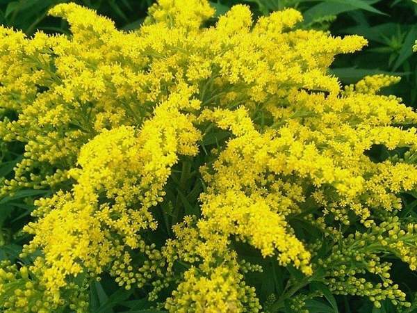 Солидаго, золотарник Goldkind (Голд Кинд). Многолетник с продолговато-ланцетными листьями яркозеленой окраски. Цветки — густые грозди мелких золотисто-желтых цветков.
