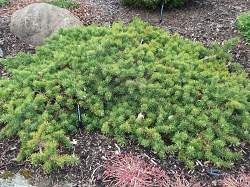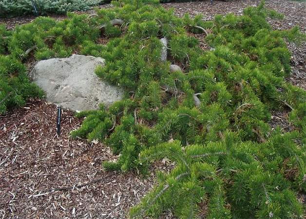 Сосна бэнкса Schoodic (Шудик). Карликовая стелющаяся форма сосны. Крона плотная, хвоя короткая, немного скрученная. Великолепна для рокариев, гравийных садов, подпорных стенок. К десяти годам достигает 30 см в высоту и 150 см в диаметре.