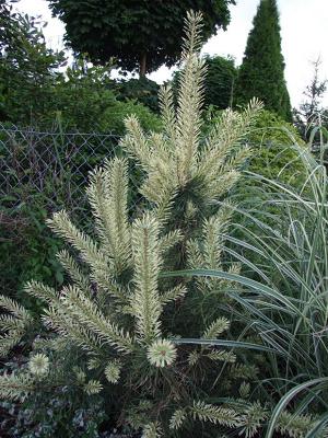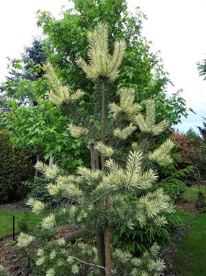 Сосна обыкновенная Bialogon (Бялогон). Польский сорт конической формы. Растет быстро. Характерной чертой является кремово-белый цвет весенних приростов. Хвоя длинная, слегка закрученная, голубовато-зеленая, собрана по 2 иголки в пучке. Через 10 лет вырастает примерно до 4 метров в высоту.