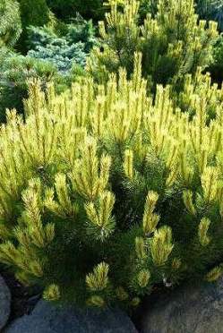 Сосна горная Albospicata Domschke (Альбоспиката Домшке). Нарастает медленно, поэтому хорошо впишется в небольшой сад. Крона яйцевидная, в десять лет около 100 см в высоту и 80 см в диаметре. Годовой прирост около 10 см в год.