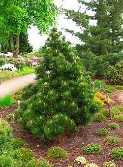 К 10-ти годам высота 150 см, ширина 100 см. Ветви густо разветвлённые, образуют широкую столбчатую форму. Хвоя очень красивая, изумрудно-зелёная, довольно длинная, в пучках по 2 хвоинки.