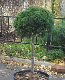 Сосна Mops (Мопс), штамб 80 см. Карликовая округлая форма диаметром около 150 см. Побеги очень короткие. Почки расположены плотно. Хвоя на молодых побегах почти прямая, 2-4,5 см длиной, темно-зеленая. Растет медленно и очень густо ветвится.