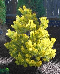 Сосна обыкновенная 'Gold Coin' (Голд Койн). Медленно растущее вечнозеленое хвойное дерево с витыми жёлто-зелеными иголками меняющими свой цвет в зимний период на золотисто-жёлтый, янтарный. Форма неправильно-коническая, широкая. Зелёные шишки созревая изменяют свой цвет на серый или красно-коричневый и могут сохраняться на дереве в течение многих лет.