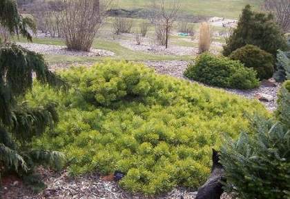 Сосна обыкновенная Hillside Creeper (Хиллсайд Крипер). Очень красивая стелющаяся форма сосны. Летом хвоя зеленая, зимой золотистая. Растет медленно. Взрослое растение достигает в высоту 50 см, в диаметр 220 см. Неприхотлива, полностью зимостойка в средней полосе России. Растет на любых почвах, предпочитает солнечную экспозицию.