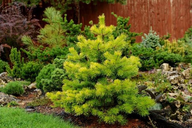 Сосна обыкновенная Trollguld (Тролгулд). Неприхотливая и при этом очень красивая карликовая сосна. Вырастает всего до 60 см; в диаметре взрослое деревце составляет 50 см. Иглы более короткие и тонкие, чем у формы Aurea, поэтому Тролгулд кажется более пушистой.