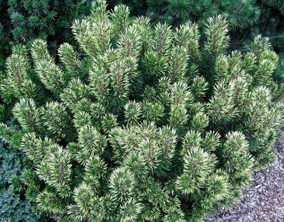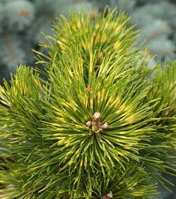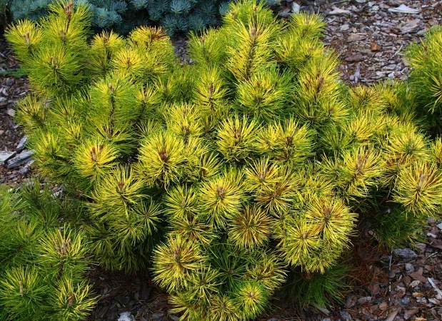 Сосна горная Sunshine (Саншайн). Карликовый хвойный кустарник с полусферической формой кроны. Достигает 1,5 м в высоту и 2,5 м в диаметре.