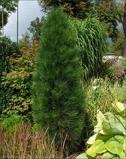 Сосна Zimmer (Зиммер). Узкоколонновидное компактное хвойное дерево до 6 м высотой и до 1 м в диаметре. В возрасте 10 лет высота 1,5-2 м, при ширине кроны всего 0,4-0,5 м. Годовой прирост до 20 см. Побеги жесткие, вертикально растущие. Хвоя темно-зеленая очень длинная, до 10 см. Малотребовательна к почвам и чрезвычайно устойчива к неблагоприятным условиям. Солнцелюбива.
