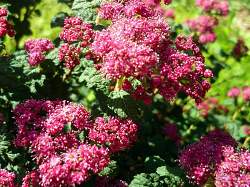 Спирея японская Bullata (Буллата). Компактный округлый плотный кустарник с вертикально растущими побегами. Достигает в высоту 40 см. Листья темно-зеленые, маленькие, яйцевидные, морщинистые. Цветет темно-розовыми цветками собранными в щитковидные соцветия до 8 см в диаметре, в июне-июле. Светолюбива, к почвам нетребовательна, морозостойкая, дымо- и газоустойчива.