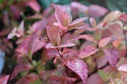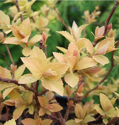 Спирея Candlelight (Кэнделайт). Образует компактный густой куст. Молодые листья сливочно-жёлтые, позже приобретают зеленоватый оттенок. Цветки ярко-розовые, собраны в щитковидные соцветия. Солнцелюбива, неприхотлива, зимостойка.