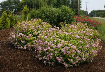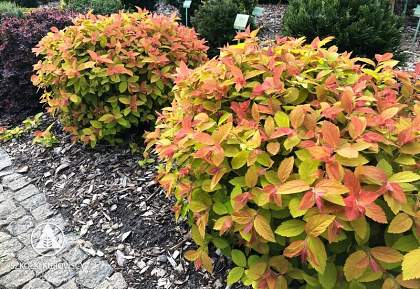 Спирея Double Play Big Bang (Дабл Плей Биг Бэнг). Маленькая (даже карликовая) спирея с оранжевыми листьями и очень крупными соцветиями. Высота и диаметр взрослого растения 50-60 см. Цветет непрерывно и долго — с июня по октябрь. Соцветия ярко-розовые, собранные в большие щитки.