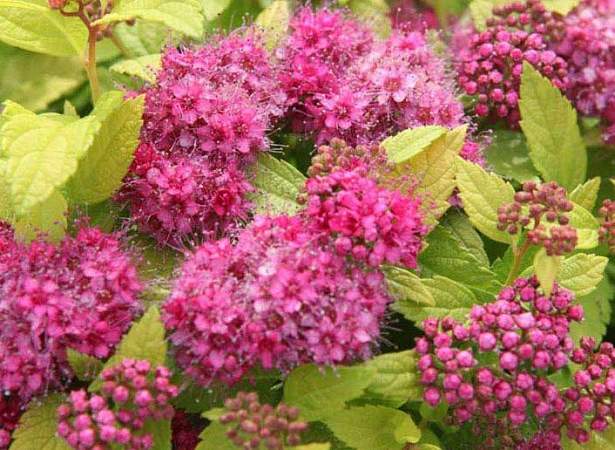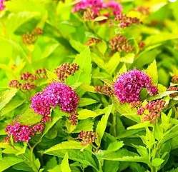 Спирея Double Play Green and Gold (Дабл Плей Грин энд Голд). Карликовый сорт с ярко-желтой листвой. Высота и диаметр взрослого растения 60-70 см. Цветет непрерывно с июня по октябрь. Листья желтые, летом зеленоватые. Цветки розовые. Куст плотный.