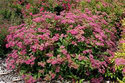 Спирея Froebelii (Фробели). Отличается пурпурными листьями весной при распускании и яркой красно-пурпурной окраской осенью, а также крупными щитковидными соцветиями насыщенно малинового цвета. Листопадный кустарник высотой и диаметром 0,8-1,2 метра с широкояйцевидными, пурпурными весной и осенью листьями, летом — зелеными.