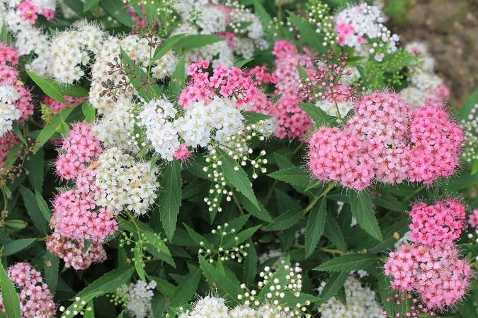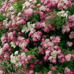 Спирея Genpei (Генпай, Широбана). Один из самых популярных сортов. Цветки могут быть розовыми, малиновыми, белыми. Они собраны в довольно крупные щитки, которые полностью покрывают округлый кустарник. Зрелище живописное. Высота кустарника около 70 см, диаметр до 120 см. Цветет с июля в течение нескольких недель.