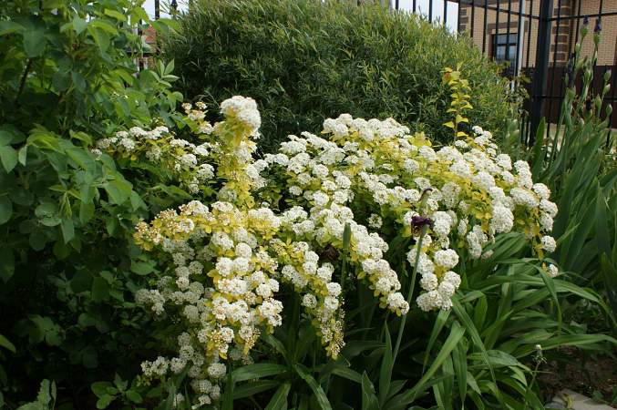 Спирея вангутта Gold Fountain (Голд Фаунтин). Отличается раскидистыми, дугообразно изгибающимися вниз ветвями, образующими красивую каскадную форму кроны. Листья мелкие, желтые в течение всего сезона, даже в тени. Цветки чисто-белые, в густых многочисленных полушаровидных соцветиях, густо покрывающих побеги. Цветет несколько недель.