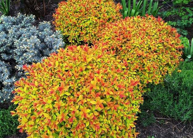 Спирея японская Goldflame (Голдфлейм). Красивый плотный кустарник высотой до 0,6-0,8 метра, диаметром до 1 метра с молодыми листьями оранжево-красного или бронзово-золотистого цвета. Затем они становятся ярко-желтыми, потом желто-зелеными на момент цветения. После цветения огненные краски листвы возвращаются. Осенняя окраска листьев — медно-оранжевого с золотом (на кислых почвах — ярче, добавляется пурпурный цвет). Иногда на кусте появляются пестрые листья.