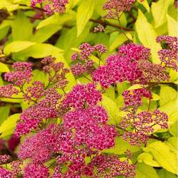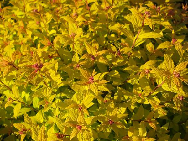 Спирея Goldmound (Голдмаунд). Плотный полукруглый кустарник 0,6 м в высоту. Листья насыщенного желтого цвета во время всего вегетационного периода. В июне спирея начинает цвести, и на фоне золотистой листвы появляются опушенные малиновые соцветия, вносящие разнообразие в насыщенный цвет кроны.