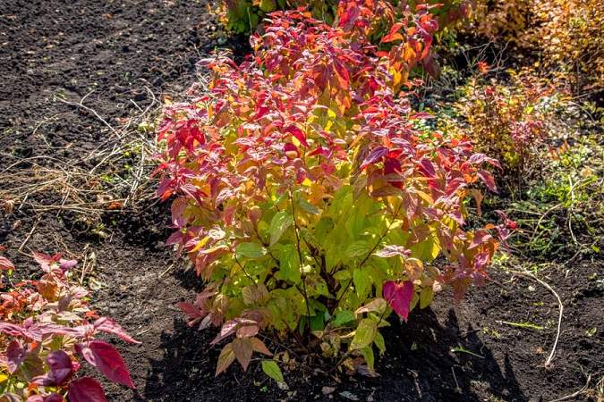 Спирея японская Macrophylla (Макрофилла). Достигает в высоту 1,3 м и в диаметре 1,5 м. Отличается крупными морщинистыми листьями, которые при распускании пурпурно-красные, позднее — зеленые, а осенью приобретают золотисто-желтые тона. Если в мае при распускании почек обрезать этот кустарник до 6-10 см от уровня почвы, то молодые растущие побеги все лето в верхней части будут иметь яркую окраску. Цветки розовые.