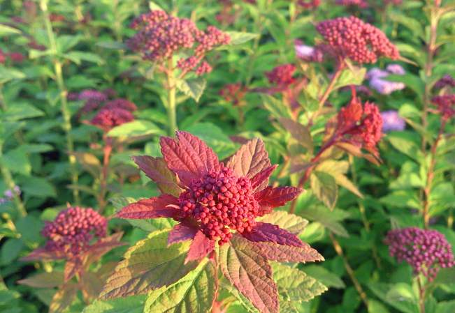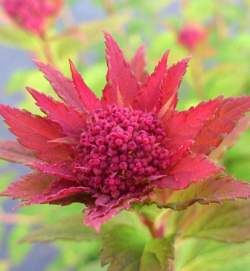 Спирея Sparkling Champagne (Спарклин Шампейн). Выносливый кустарник высотой 100 см и шириной 150 см. Крона густая. Молодой весенний прирост насыщенного оранжево-бордового цвета. Летом листья лаймово-зелёные, осенью огненно-красные и жёлтые.