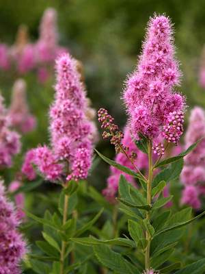 Спирея Билларда Triumphans (Триумфанс). Гибрид спиреи Дугласа с иволистной (S. douglasii x S. salicifolia), появившийся в 1854 году во Франции. Стройный салютообразный куст высотой около 180 см. Соцветия узкоконические, пушистые, ярко-розовые. Цветение в июне обильное.