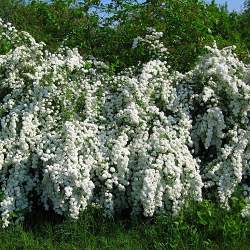Спирея Ван-гутта. Высота 2 м. Раскидистый, широкий, сильно-растущий кустарник. Листья темно-зеленые. Цветки белые в густых соцветиях, полностью покрывают прошлогодние побеги. Красиво и обильно цветет. Морозоустойчив.