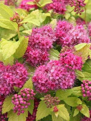 Спирея Zen Spirit Caramel (Зен Спирит Карамель). Миниатюрный кустарник, образующий подушки. Молодые листочки карамельно-оранжевые. Окраска сохраняется в течение нескольких недель. Осенью листья в красных тонах. Цветет пурпурно-розовыми щитками. Высота до 40-50 см. Очень хороша в рокариях, бордюрах, маленьких изгородях. Подходит для посадки в кашпо и кадки.