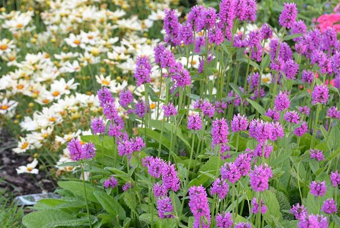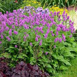 Стахис монье Hummelo (Хуммело). В цвету такой красавец! Соцветия-головки ярко-лиловые, привлекающие внимание. Травянистый многолетник с прямостоячими цветоносами до 60 см высотой. Листья прикорневые широко-ланцетные. Летом появляются плотные соцветия пурпурно-красных цветков. Цветение продолжительное с июля по август.