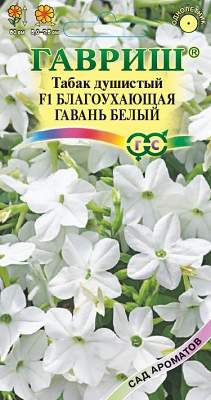 Табак Благоухающая гавань белый F1 душистый. Яркая интересная серия табака душистого с насыщенной окраской крупных душистых цветков, собранных в рыхлое метельчатое соцветие. Растение высотой 60 см, усыпано длинными бутонами, направленных вверх. Цветет массово в течение всего сезона. Белоснежные цветки не закрываются днем, а ночью особенно сильно ощущается их нежных аромат. Предпочитает открытые солнечные места с умеренно плодородными и влажными почвами. При посеве на рассаду семена не присыпают почвой. Всходы появляются через 10-12 дней. Первую пикировку проводят в ящики, вторую — в горшки по 4 штуки. Табак — растение холодостойкое, но в открытый грунт его высаживают только после окончания весенних заморозков. Используют в групповых посадках, миксбордерах, идеально подходит для бордюров, озеленения балконов, лоджий. В срезке долго сохраняет свежесть.