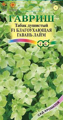 Табак Благоухающая гавань лайм F1 душистый. Яркая интересная серия табака душистого с насыщенной окраской крупных душистых цветков, собранных в рыхлое метельчатое соцветие. Растение высотой 60 см, усыпано длинными бутонами, направленных вверх. Цветет массово в течение всего сезона. Желтовато-зеленые цветки не закрываются днем, а ночью особенно сильно ощущается их нежных аромат. Предпочитает открытые солнечные места с умеренно плодородными и влажными почвами. При посеве на рассаду семена не присыпают почвой. Всходы появляются через 10-12 дней. Первую пикировку проводят в ящики, вторую — в горшки по 4 штуки. Табак — растение холодостойкое, но в открытый грунт его высаживают только после окончания весенних заморозков. Используют в групповых посадках, миксбордерах, идеально подходит для бордюров, озеленения балконов, лоджий. В срезке долго сохраняет свежесть.