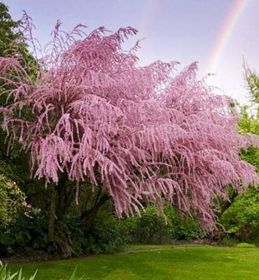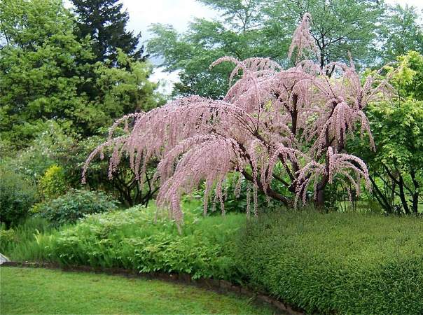 Тамарикс четырехтычинковый (тетрандра). Листопадный кустарник высотой до 5 м с дугообразно изогнутыми ветвями. Листья ланцетные или яйцевидно-ланцетные с заостренной верхушкой, длинной до 3 мм. Окраска листьев темно-зеленая. Цветки собраны в конечные кисти длинной до 5-6 см.