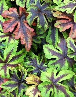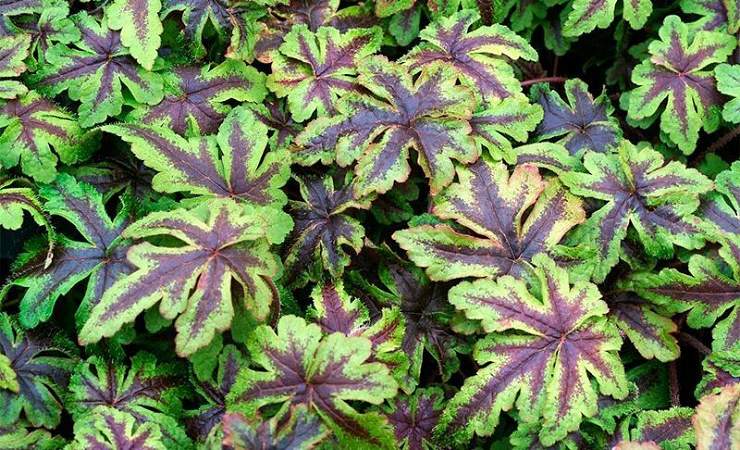 Тиарелла Jeepers Creepers (Джиперс Криперс). Очаровательная малышка с необычайно эффектными резными листочками светло-зеленого цвета с ярко выраженной коричневой или пурпурной серединой. Неприхотлива, хорошо зимует, но не переносит засухи. Требуется умеренный полив.